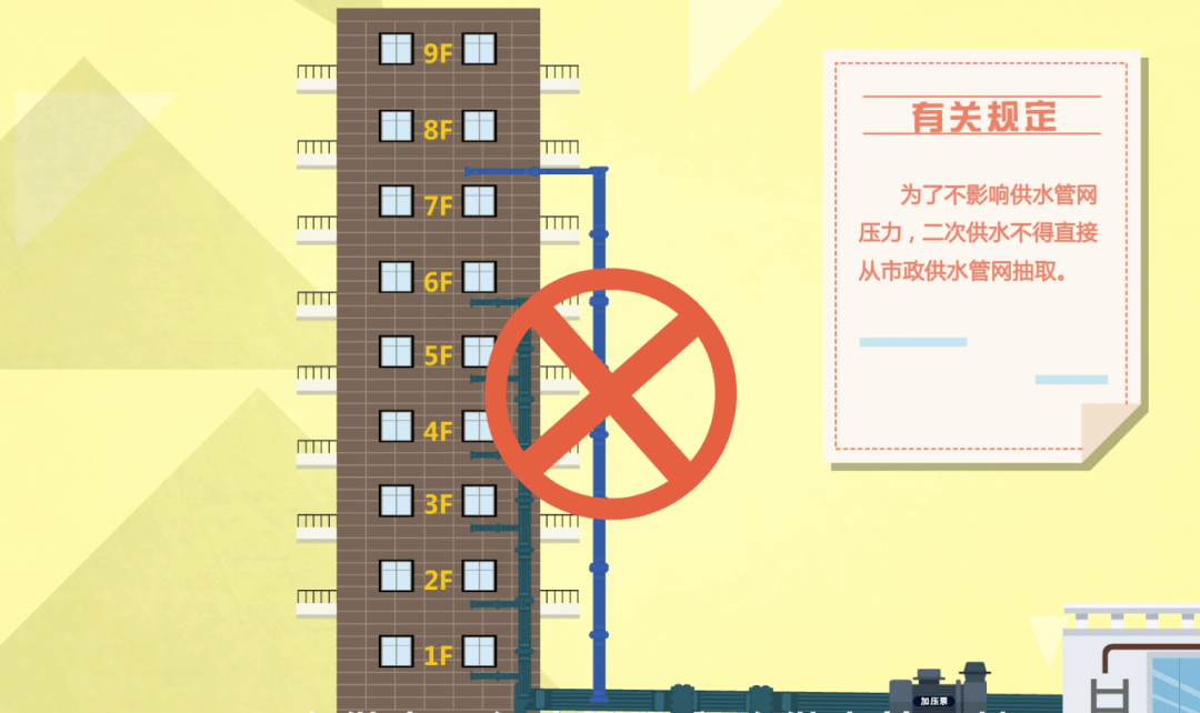 因为市政水压有限,无法直接供到高层,所以 高层建筑就必须设有二次供水设备,以保证高层用户用水。但是按照有关规定,为了不影响供水管网压力,二次供水不得直接从市政供水管网抽取,需要设立 水箱和水池。