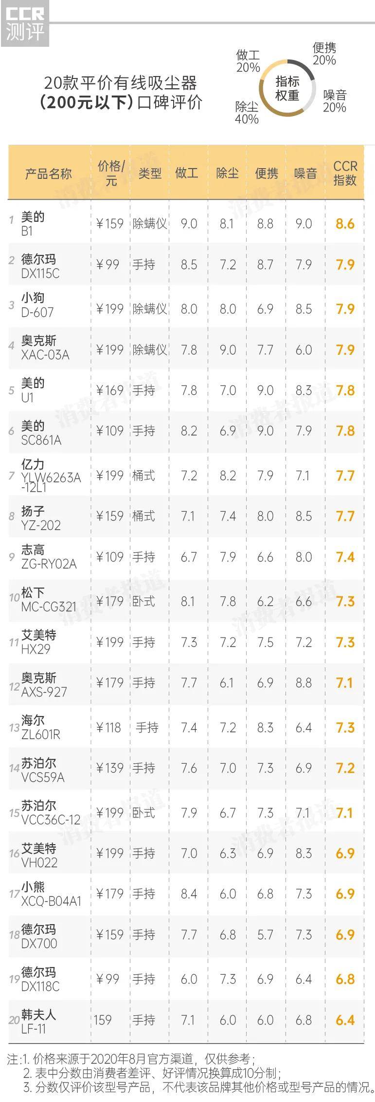 口碑结果显示,20款平价有线吸尘器中,表现较好的是美的 B1、德尔玛 DX115C。