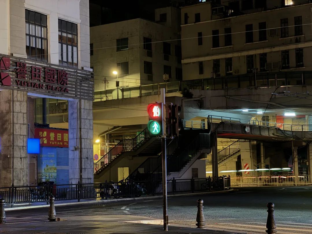 不过画面亮处的噪点控制倒是表现得非常不错,所有黄色路灯能直接照亮的地方都变得非常干净。只不过高光的部分依旧有Apple夜景模式“祖传”的堆栈溢出问题。