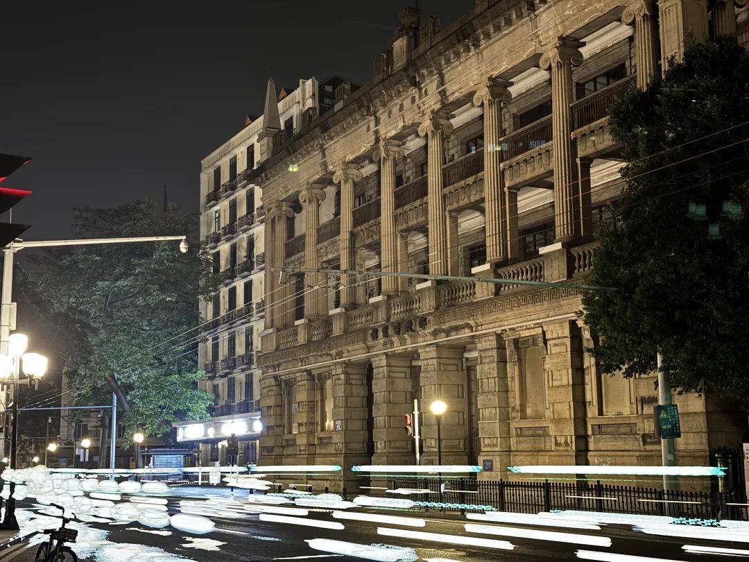 接下来这张适合iPhone 15 Pro Max主摄像头搭配夜间模式拍摄的“长曝光”也是同样的情况:建筑物表面的主干处理得非常不错,复杂的柱顶甚至是建筑屋顶上的招牌都清晰可辨。
