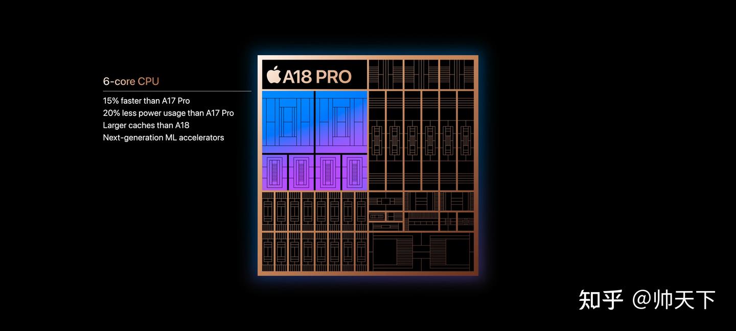 带来了全新的沙漠金配色,这个配色我也非常喜欢。芯片从A17Pro升级到了A18Pro,也是第二代3纳米工艺,性能、能效、续航更好,CPU比A17Pro提升了15%,GPU比A17Pro提升了20%的性能,可以看到摩尔定律下,制程换性能也来到了屏瓶颈,收益不大。