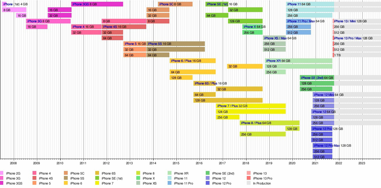 iPhone是从2007年开了第一个发布会,在当时的发布会上发布了iPhone机型。这可是现在所有iPhone的老祖宗了。随后基本每年1~2次,17次发布会,发布了iPhone 3G~iPhone 13共计33个机型。