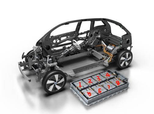 下面,我们以BMW i3为例,来给大家分享下。该车的动力电池中一共有96个电芯组成,每12个电芯组成一个模组,一共是有8个模组。
