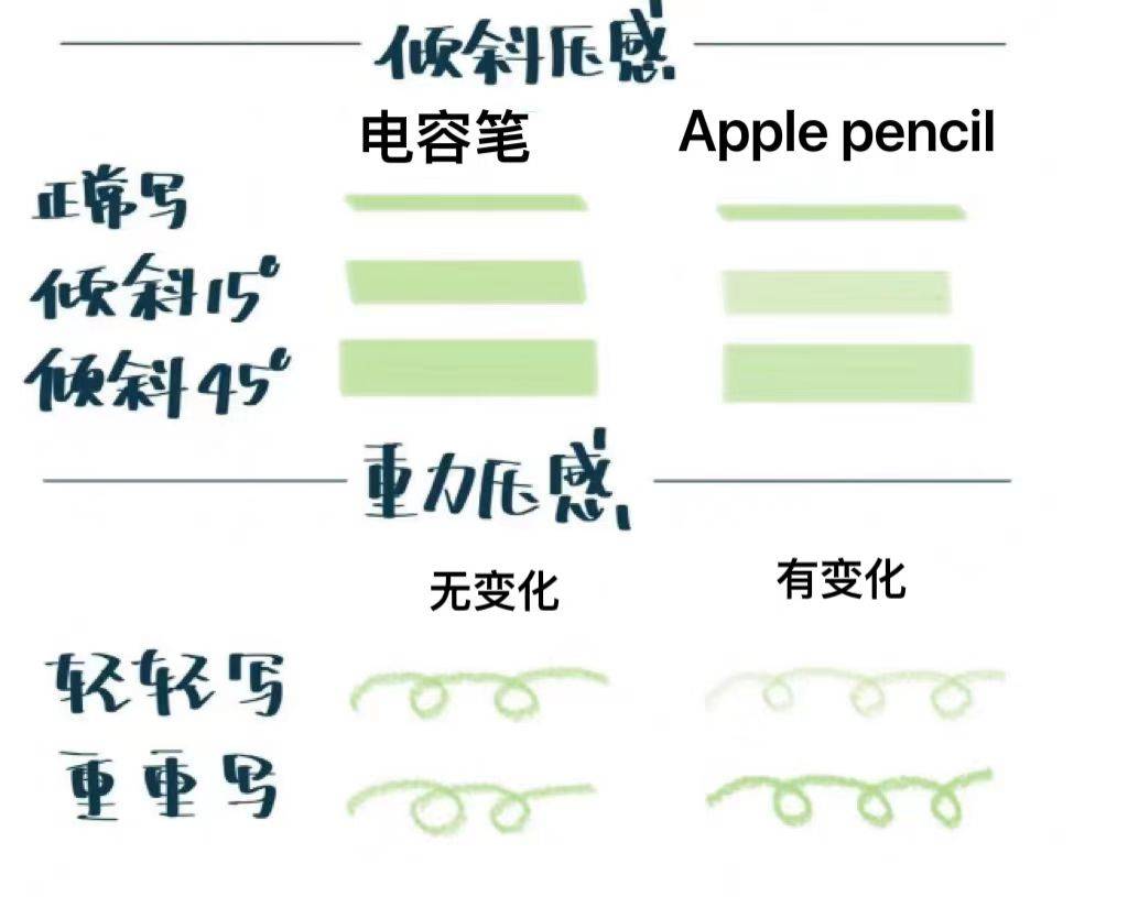 电容笔:在压感上,电容笔只具备了倾斜压感功能,而倾斜压感功能在procreate和sketchbook两个画画软件中倾斜压感功能是在特定的笔刷下才可以有倾斜压感的粗细变化,所以比较有局限性,不推荐有专业绘图的选择。