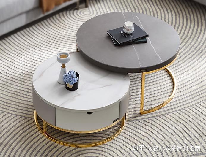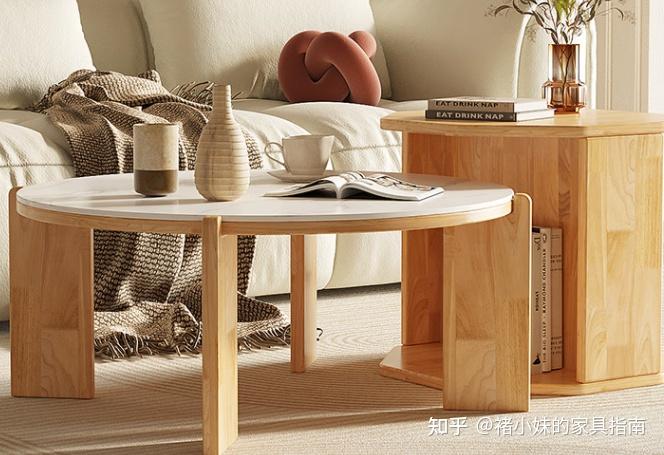 推荐圆形茶几+边几组合,大理石纹路的岩板桌面+橡胶木桌腿,再加上纯实木的边几,风格比较百搭,价格也不是很贵。