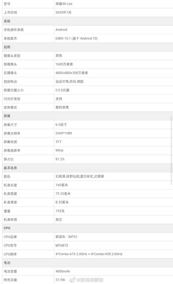 【手机中国新闻】此前,我们曾报道过荣耀30Lite手机的消息。6月19日,微博博主@数码闲聊站发文公布了这款手机的参数信息。荣耀30Lite搭载联发科处理器,配备90Hz刷新率屏幕,后置4800万像素三摄。