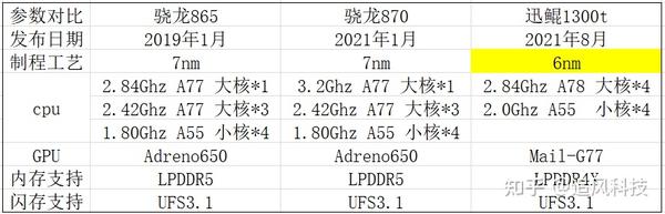 最大的区别是支持的内存规格,1300T仅支持LPDDR4X,而骁龙865支持LDPPR5。