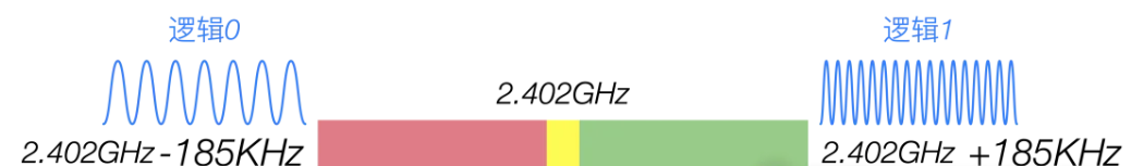 低功耗蓝牙的GFSK的偏移量一般为±185KHz,首先确定一个中心频率,比如中心频率为2.402GHZ,逻辑1是在中心频率的基础上加185KHZ,逻辑0是在这个基础上减去185KHZ