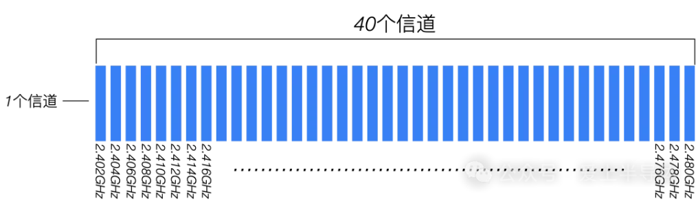 低功耗蓝牙有40个信道,信道范围从2.402GHz到2.480GHz,每个信道的间隔是2MHz