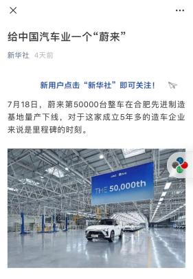 7月18日,蔚来第50000台整车在合肥先进制造基地量产下线,对于这家成立5年多的造车企业来说是里程碑的时刻。