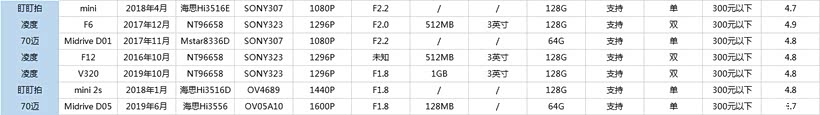 主控方案:海思Hi3516D图像传感器:OV4689摄像像素:前镜头400W主镜头光圈:F1.8影像分辨率:1440P最大支持内存:128G安装方式:3M胶24小时停车监控:降压线盯盯拍mini 2s这款是单镜头,支持1440P分辨率,不带屏幕,采用的海思Hi3516D,属于中低端芯片,OV4689是具备动态400W像素,不过不支持无光夜视,晚上光线比较暗效果相对会差一些,按照这售价跟配置来看,性价比算是可以的。70迈Midrive D01行车记录仪,推荐指数:★★★☆☆