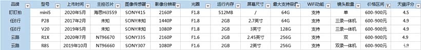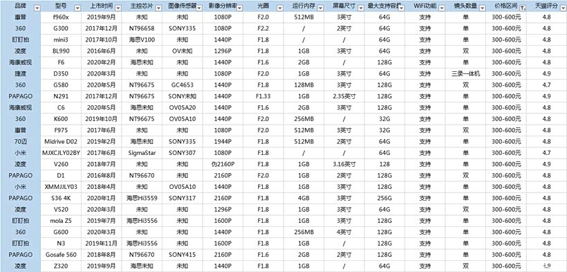 2020年双11选购行车记录仪推荐哪些款式我们先把市面上最热销的款式做个汇总,总共是38款记录仪,总结下来也就13个品牌。