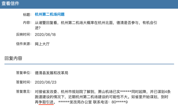 2021年9月7日,杭州市规划局在一条关于“建议增加谋划建设杭州第二国际机场项目”的反馈中,回复称“未采纳”,理由是“需要在上一层级规划或战略规划中明确后,落实到本轮市级国土空间总体规划中。”