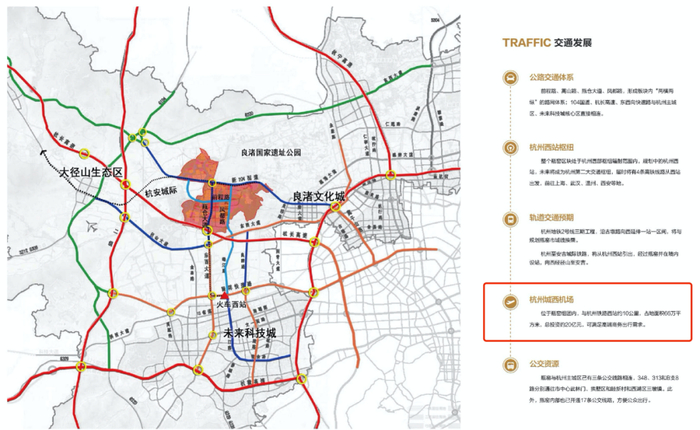 在2020年的读地手册上,确实写着“杭州城西机场”的规划,位于瓶窑组团,距离杭州西站约10公里