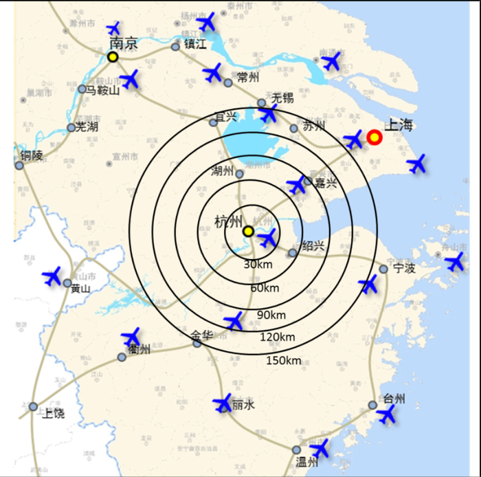 我们从杭州周边的机场分布中,可以看到一些端倪。目前,也就西部和西北部有空间