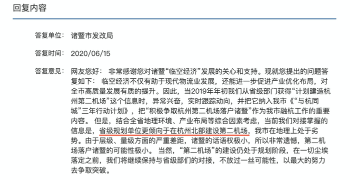 不过,诸暨发改委在回复网友时明确表示,“可能性极小”,并且还剧透说,省里更倾向于把第二机场建在杭州北部