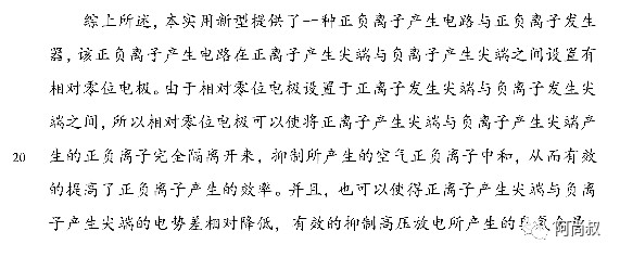 专利说明书上,对这项实用新型的技术仔细说明了一番,大概意思就是,他们提供了一种正负离子产生电路与正负离子的发生器,可以实现抑制高压放电所产生的臭氧含量与提高正负离子产生效率的功能。