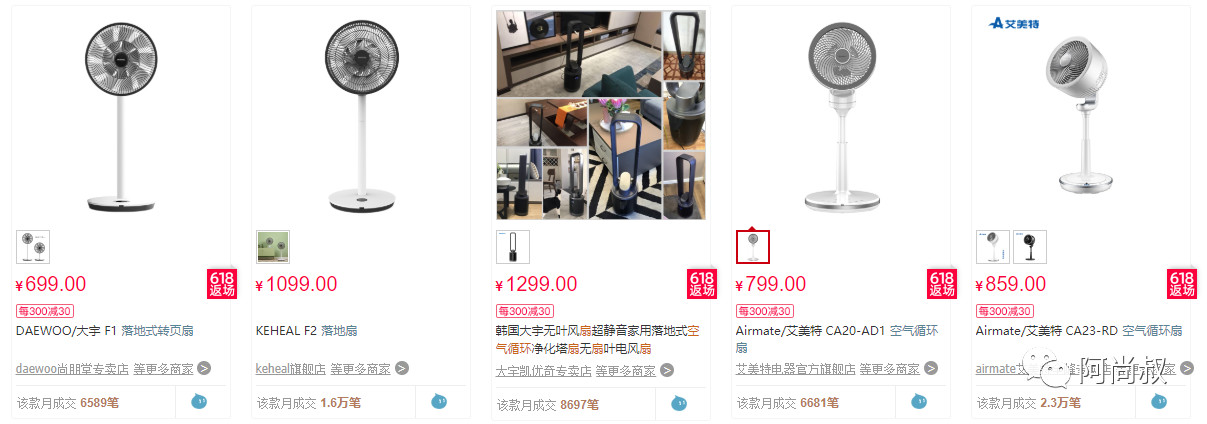 在天猫上搜空气循环扇,科西和大宇的权重比较高,出现在前两位。循环扇是区别于电风扇的新品,这个概念早就有了,近两年才在中国市场普及,淘宝上现在有近200个品牌,除了戴森的无扇叶风扇外,其余的外观很相似,价位在500-2000之间不等。