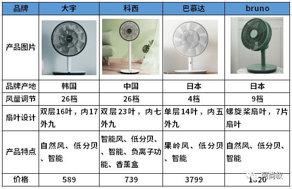 我们且从扇叶、功能等方面一起对比下:大宇、科西、巴慕达、bruno: