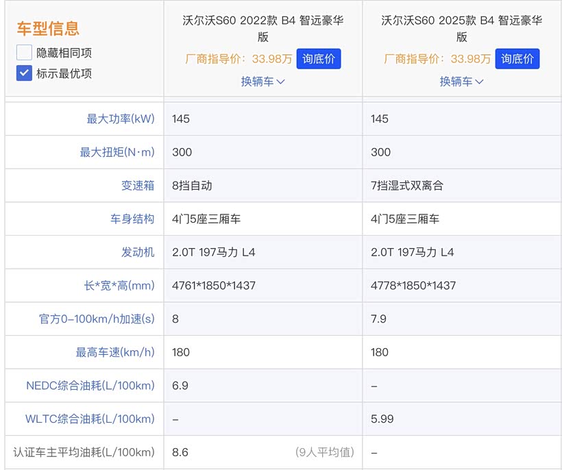 参考官网目前在售的车型,一晃沃尔沃S60已经换代到了2025款,总结了一下,最大的改动是从2023款开始,车机换成了安卓系统。8AT变速箱改为7档DCT湿式双离合变速箱(仅B5智雅版还保留了8AT变速箱)。另外,还取消了自定义驾驶模式(22款及之前的车型有ECO模式、舒适模式和运动模式)。