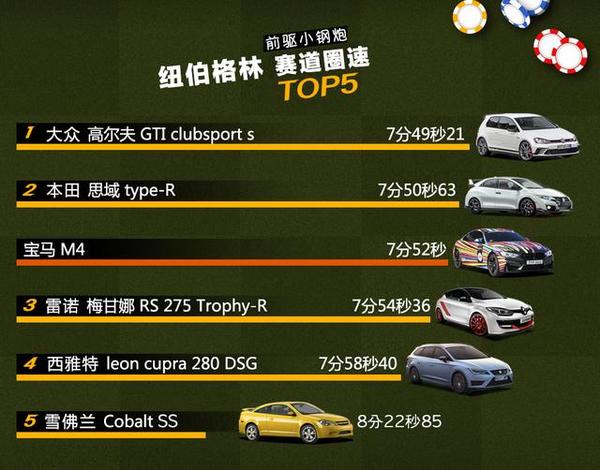本田思域 type-R 创造了纽北最快圈速还没有1年时间,就被上面提到的高尔夫超过了。可见现在各大厂商竞争之激烈。本田思域 type-R的圈速排名为91名,比奔驰SL65 AMG(7分51秒)快了一点点儿,比兰博尼基LP560-4(7分52秒)快了1秒以上。