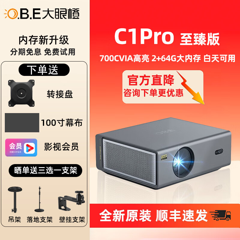 大眼橙C1 Pro至臻版投影仪家用 700CVIA白天高亮高清投影机 无线投屏游戏卧室宿舍家用影院 国家补贴 【咨询立减】C1 pro至臻版(700CVIA) ¥1499起 8. 2024 M站4K投影仪家用白旗舰版 云台幕布套餐