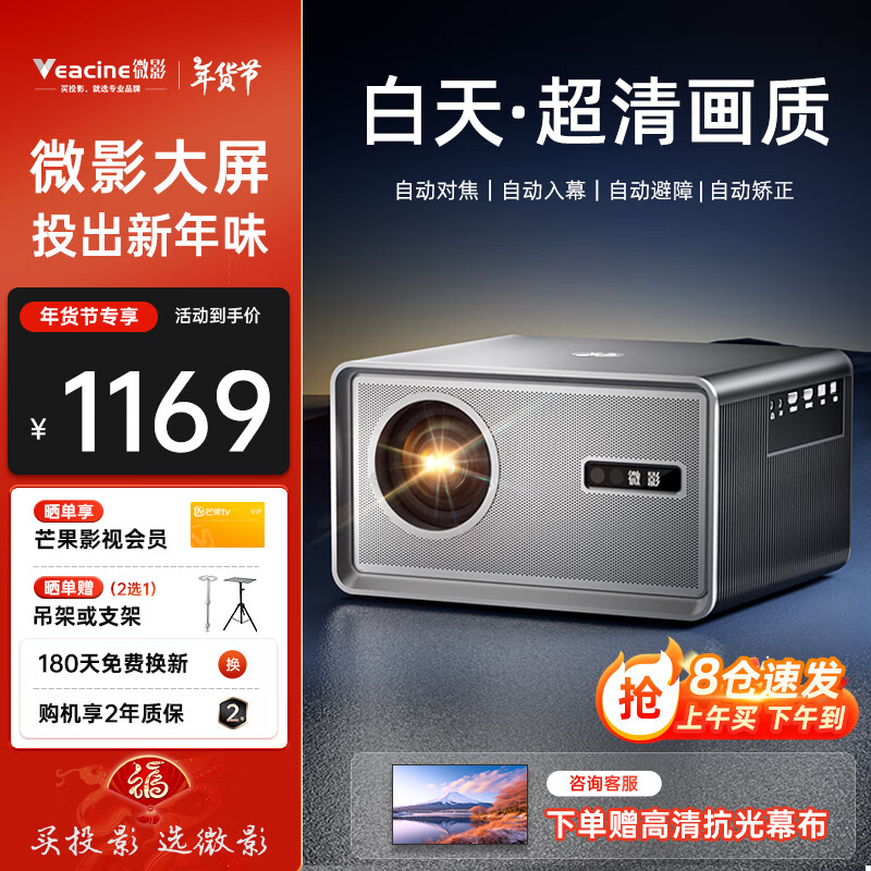 微影投影仪家用办公家庭影院超高清白天会议室专用客厅卧室智能投影机手机投屏电视投影一体机 S6超清版【自动对焦-白天高清-32G】高清幕布 ¥1299起 5. 4K投影仪家用办公无线投屏白天直投会议卧室客厅一体S7