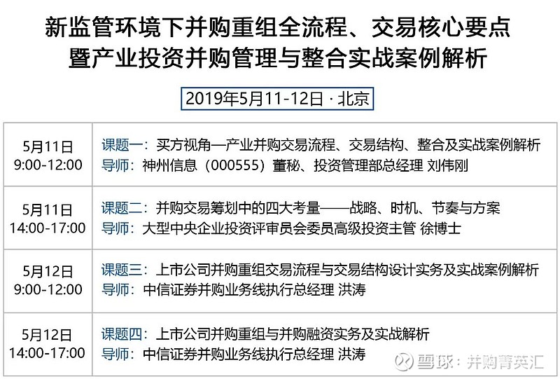 君汉商学院《中国并购菁英实战班》将于5月11-12日在北京开设专题课程——《新监管下上市公司产业并购全流程、并购交易筹划、交易核心要点实务与实战案例解析》。