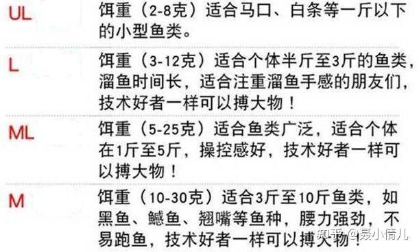 UL、L:适合小个体鱼,例如马口、白条等,常用拟饵是小克重的饵。ML,M,MH:适合中大型个体鱼,例如翘嘴、鳜鱼、鲶鱼等,常用拟饵是中克重的饵。H、XH、XXH:打黑专用(黑鱼),一般用大克重的饵。新手入门会将路亚竿的调性和硬度混为一谈,其实这两个并不是一个东西。强度指的是要竿子达到调性需要用的力,同样调性但是不同强度的鱼竿,所需要的负荷重(鱼重量)不同。