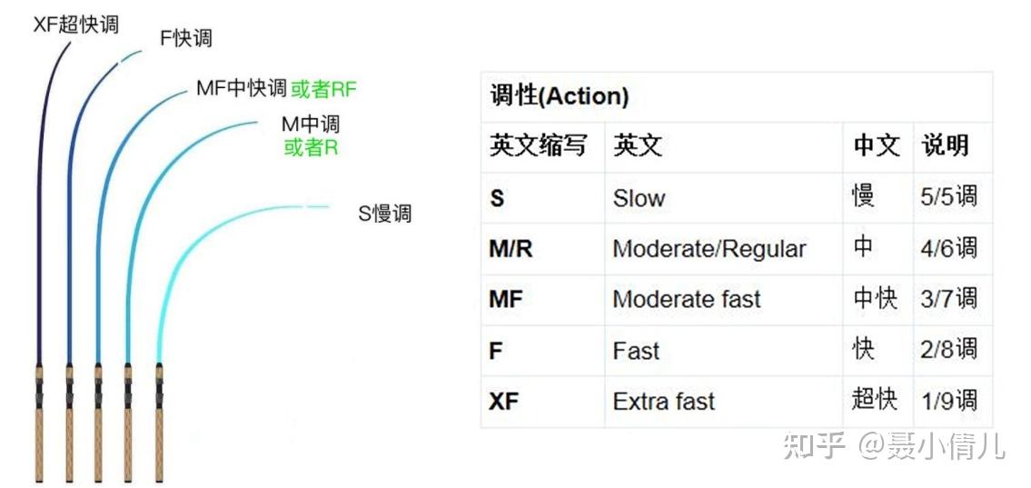 X-F(超快)、F(快):路亚竿稍较为灵敏,有利于路亚软饵的操作和精准抛投,是我们常说的感度好,能很快感知鱼的咬口,但容易跑鱼。MF(中快):性能居中,硬饵和软饵都能操作。M(中)、S(慢):适合操作硬饵,粘鱼性好不易跑鱼,简而言之就是容易感到鱼汛,对鱼线压力较小。国内大部分路亚竿都是MF和F调性,XF、M和S都比较少见,UL、L硬度更多F调,ML以上更常MF调。