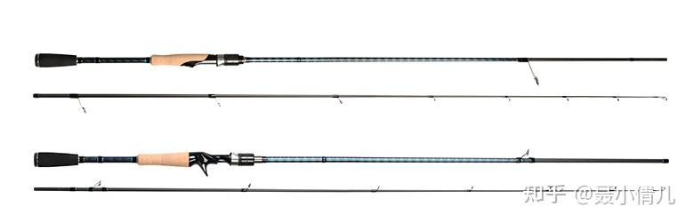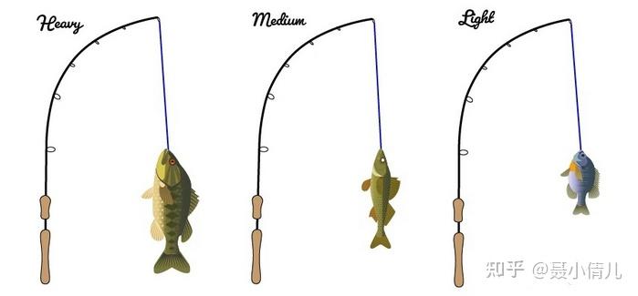 二、路亚竿调性、强度和长度的选择1、调性(action):指的是路亚竿受力时竿身从哪里开始弯曲,以及弯曲的程度。台钓竿调性分19、28、37、46,55,路亚竿调性则分X-Fast(超快)、Fast(快)、Moderate Fast(中快)、Moderate(中)、Slow(慢)。竿子弯曲处越靠近杆尖为快,弯曲处越靠近杆柄处为慢,越靠近竿梢越灵敏。
