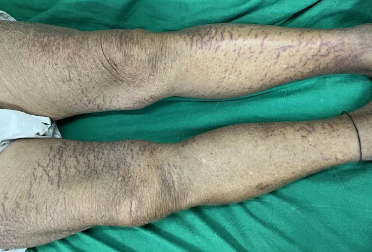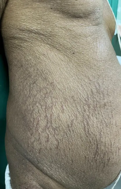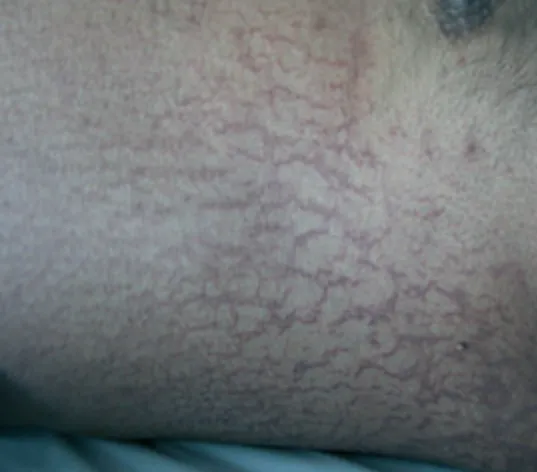 皮疹可累及任何体表部位,通常可见于双小腿前外侧面,亦可累及背部、躯干及上肢。