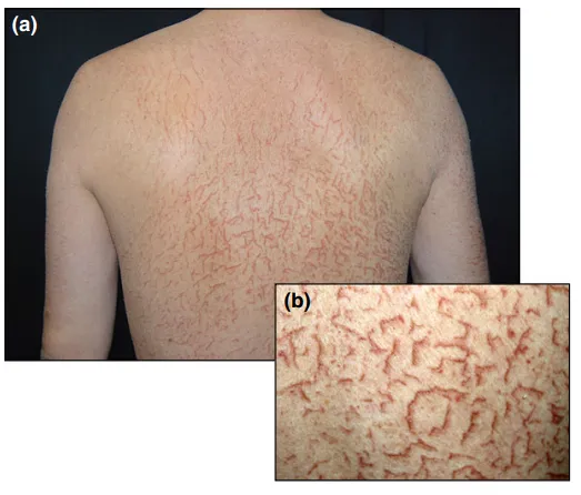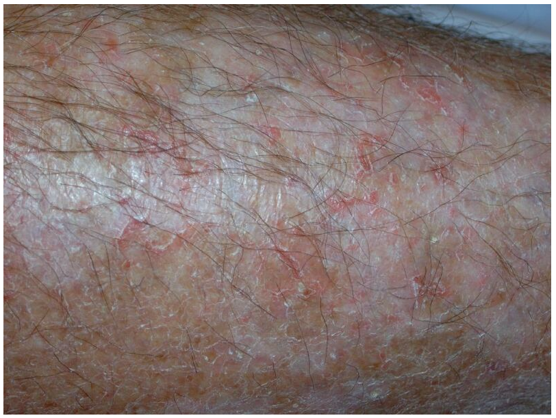 起初为皮肤干燥、皮纹加深,随着疾病进展开始出现皲裂、裂隙(表皮水分丢失所致),皲裂性皮肤呈多角形或曲线样模式。不规则皲裂、脱屑模式有时被称为“Crazing Ping”。常伴瘙痒。随着搔抓或揉搓后出现诸如红斑、水肿、渗出、苔藓样变、出血、抓痕、感染等继发性改变。