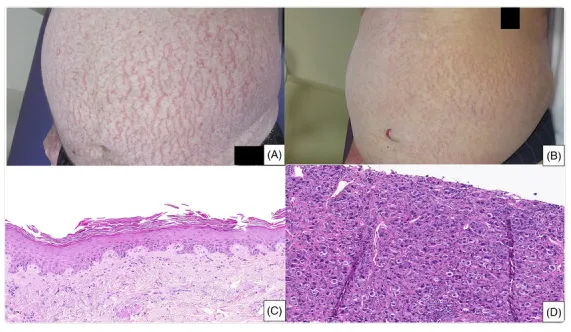 多呈轻度亚急性海绵水肿性皮炎样表现,可见角化过度、角质层不规则且致密、棘层增厚、海绵水肿、不同程度的炎症细胞浸润。