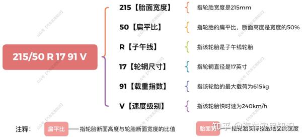 轮胎规格通常标注在轮胎侧面。比如,我们以下图中的“215/50R1791V”为例,来说明一下它们的含义,至于对每个数字和字母含义的详细讲解,这里就不再赘述,大家可以去看我之前写的这篇 《轮胎型号上的数字代表什么意思?》。