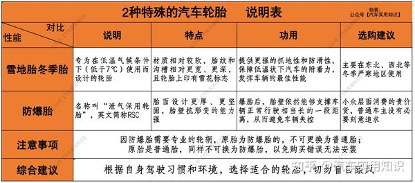 除此以外,还有2个特殊的选择——雪地胎冬季胎、防爆胎。具体可参照下表: