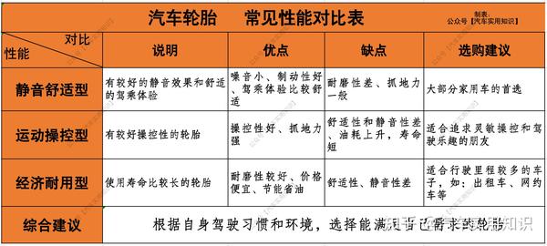 步骤三:选轮胎性能(相当于选运动鞋、登山鞋等…)根据轮胎花纹性能的不同,主要可分为:静音舒适型、运动操控型、经济耐用型。具体可参照下表: