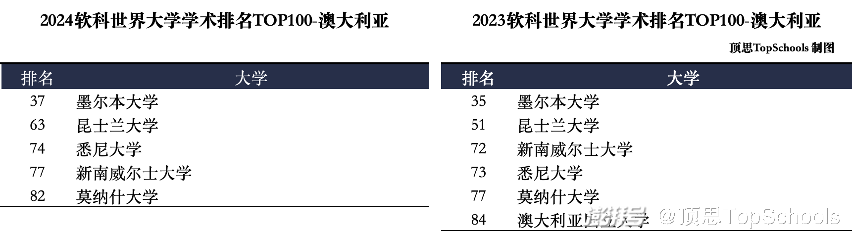 在软科榜单表现上,今年澳大利亚进入TOP100名校数量减少一所,为澳大利亚国立大学。澳大利亚排名最高的大学为墨尔本大学,较去年下降两个位次,为37名,而形成对比的是,墨大在QS的榜单上是13位。与此同时,其他澳洲大学也出现了不同程度的位次下跌,昆士兰大学从51位跌落到63位,下降12个位次。