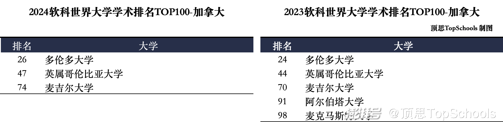 和去年相比,加拿大同样在上榜数量和排名位次上出现了明显的下降,阿尔伯塔大学和麦克马斯特大学跌出了TOP100,TOP100仅剩的3校也出现了位次微跌。尽管上榜TOP100数量和U.S. News一致,但排名不及后者,也同样低于更早前的QS榜单。