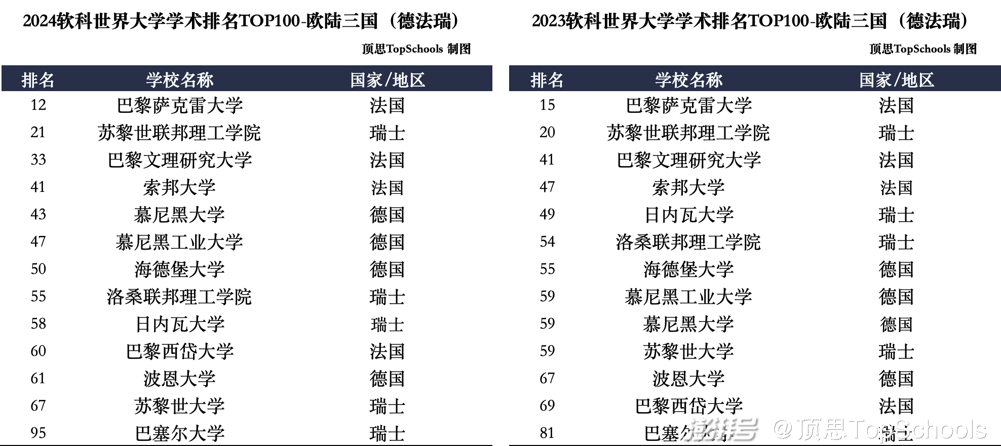 在排名上,法国高校名次表现较好,巴黎萨克雷大学为欧陆第一高校,排名上升到了12位,其余三所大学的排名也优于另两家榜单。另一方面,和软科2023排名相比,德国和法国大学名次均实现了不同程度的上升。