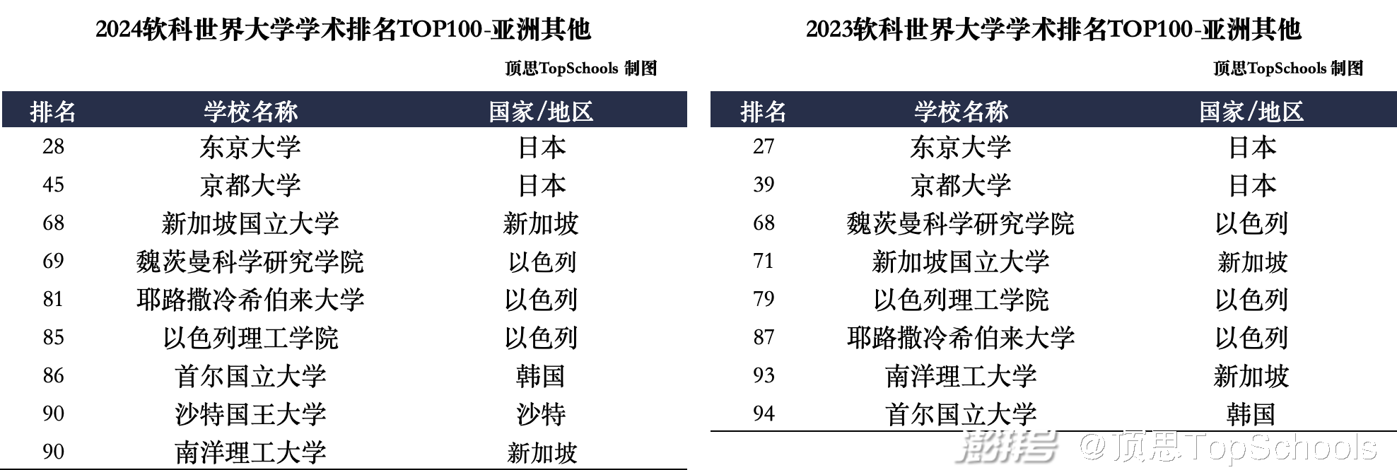 亚洲其他上榜TOP100的国家还有日本、韩国、新加坡、以色列和沙特。这其中,沙特国王大学是今年首度跻身TOP100。日本两所大学排名略有下降,新加坡和韩国略有上升。但和其他榜单相比,新国立和南洋理工排名相差太远,在QS榜单,两校分别为第8位和第15位,U.S. News为22和27位。而韩国在QS上TOP100名校数量达到5所,首尔大学更是排进31位。