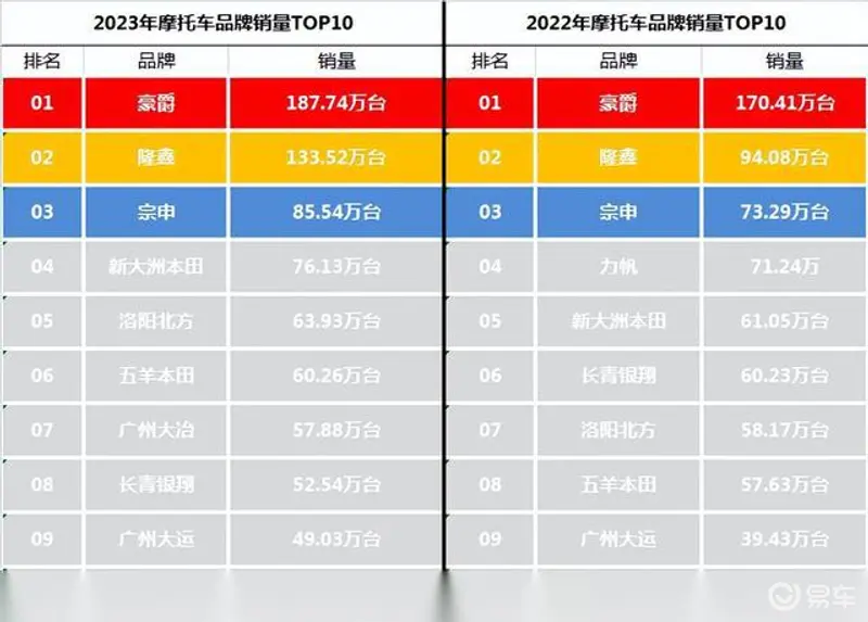 豪爵、隆鑫、宗申三大摩托车品牌仍稳居销量排行榜前三;