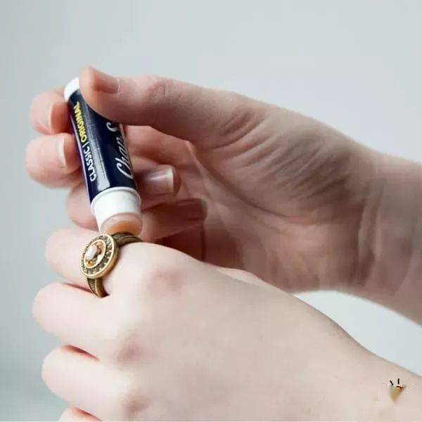 戒指戴久了就会比较紧,要取下来很困难。用唇膏润滑一下戒指周围的皮肤,戒指就能轻松取下了。