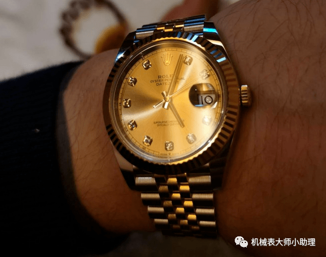 “大金链子小手表”,大众认知中的手表就是劳力士,劳力士的金表更是堪称一代经典。黄金与精钢搭配的金属组合,再加上绿色的罗马数字时标,在腕表上融合交汇,形成独特的美学风格。腕表采用蚝式钢打造蚝式表壳,标志性的三角坑纹外圈(俗称“狗牙圈”)的材质是黄金,表径为41毫米,适合大多数人佩戴。盘面3点钟位置设有凸透镜日历显示窗口,便于读取日期。