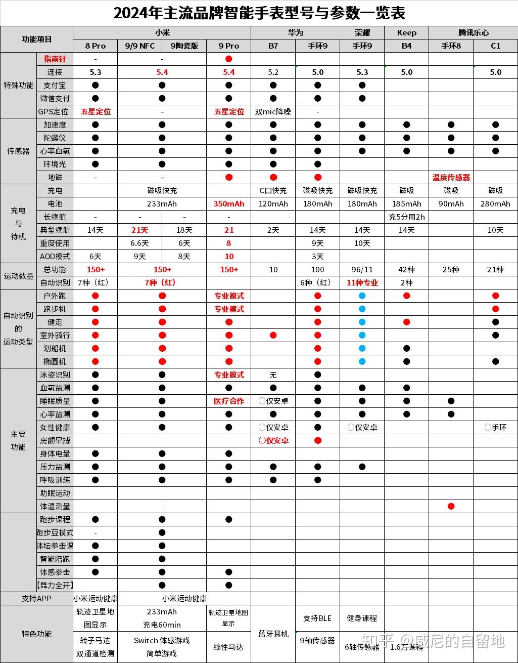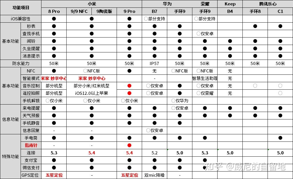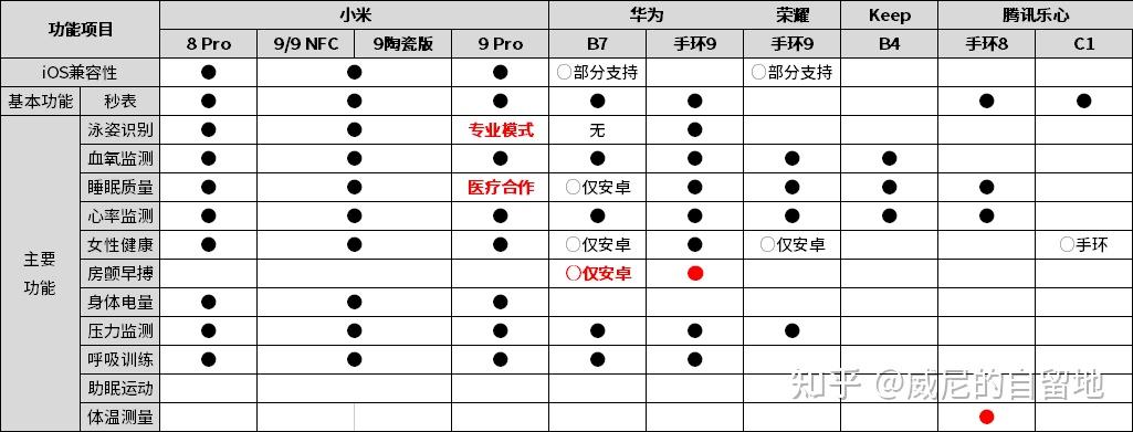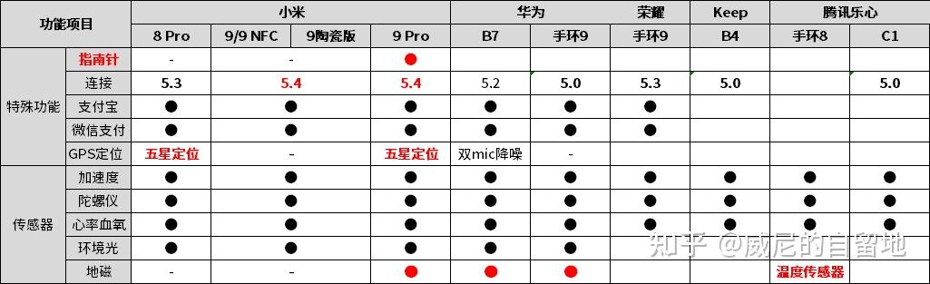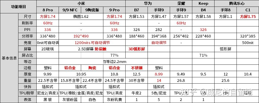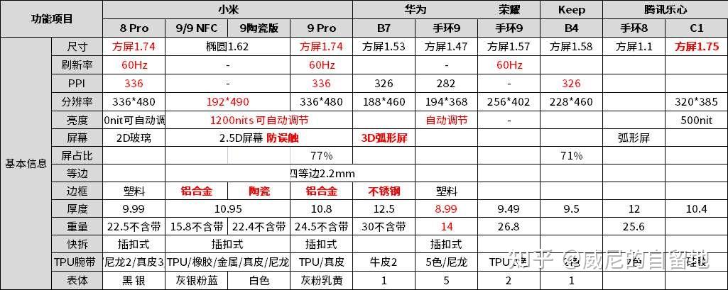 优势项目已标红,表格空白处代表官方未公布华为B7、小米9 的表盘是跑道形,显示面积小;华为9、FIT2、小米9Pro、荣耀9则是长方形,好处是显示面积大,可以显示的信息量更多;其中,小米9 Pro面积最大,华为FIT屏幕也不小。不过,显示内容多少与分辨率也有关,小米9屏幕面积小但像素密度比华为9都高。