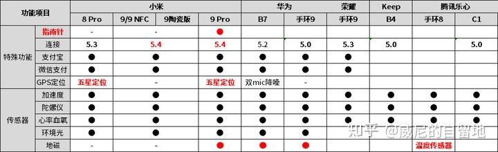 各品牌产品传感器对比5、地磁传感器:有的品牌叫霍尔传感器,实际上都是一个东西,大多数手表只有前4种(有的只有前3种)。配备磁感应传感器的手环基本上都是最新型号,比如小米手环9Pro、华为9、B7。