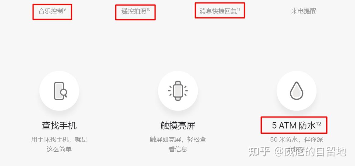某手环功能描述,注意右上角的数字代表有前提条件仔细看商品介绍,尤其是支持的运动类型、自带的功能,有的功能带数字或*,这代表该功能使用有限制,需要仔细研究后面的小字部分,切记。