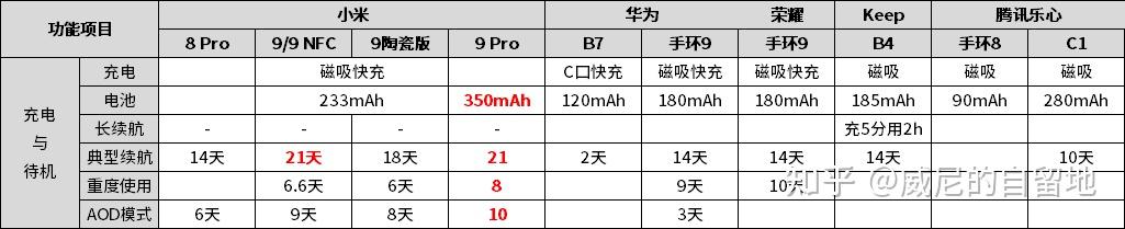 新出的小米9、华为9都支持息屏显示(AOD模式,屏幕常亮),这种模式下,小米9 Pro官方试验10天、手环9为9天,华为9是3天,续航不如小米。