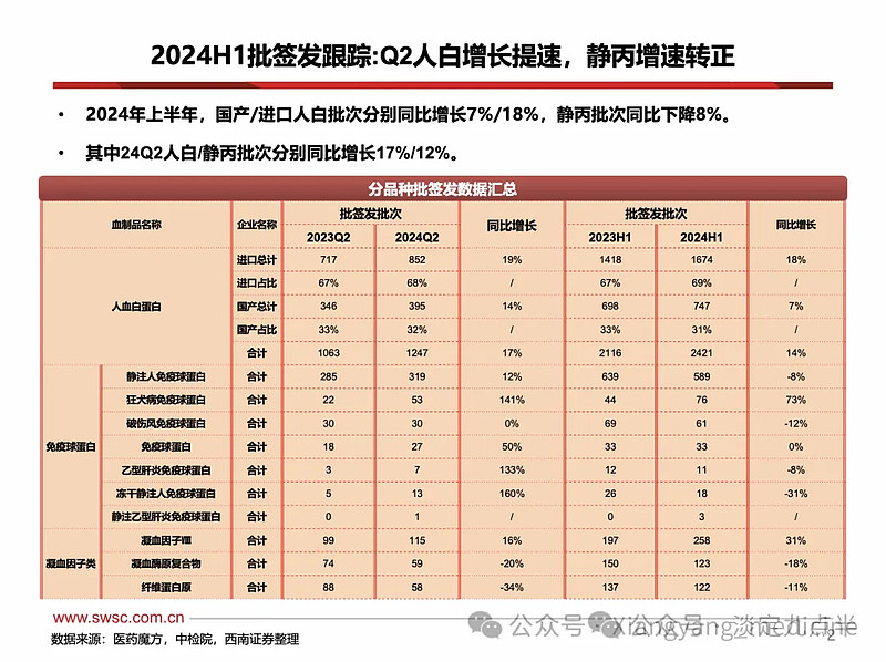 上海莱士:2024H1共9个品种获批,其中人白获批90批(+10%),静丙获批86批(-3%),狂免获批9批破免获批3批(-25%),乙免获批2批(+0%),冻干静注乙免获批2批(+0%),凝血因子Ⅷ获50批(+117%),PCC获批6批(+500%),纤原获批44批(+0%)。