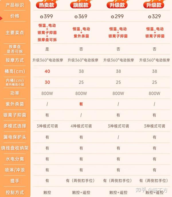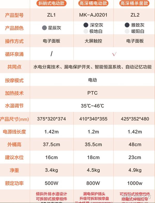 市面上有很多值得信赖的泡脚桶可选,大家可以去做一下功课。以下这两款,有一款我目前在用的,两款的人气都很高,口碑都不错,可以选择试试。美的的这款,我用了一年多了,使用感不错,安全性也高,可以放心入手。关于规格这方面,大家可以根据下面的这个表去考虑做做功课再下手。